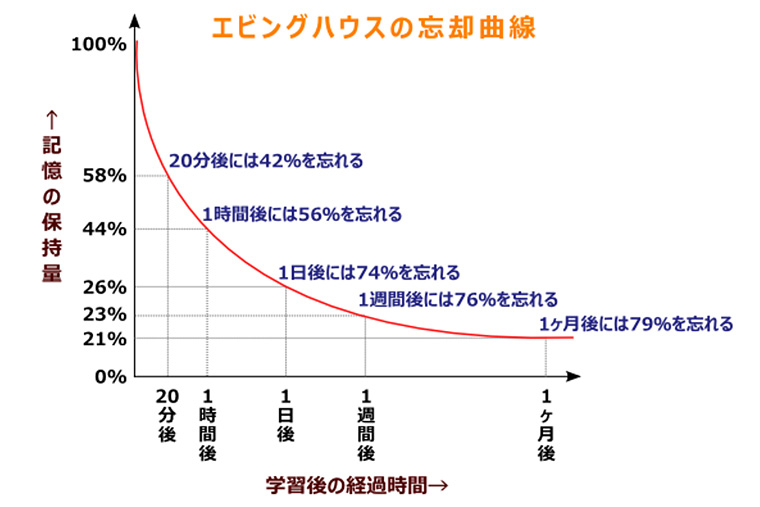 人が学習したことを忘れるまでのメカニズムを端的に表したものに『エビングハウスの忘却曲線』があります。これによると、人は「1時間後に56%忘れる」とあり、早めの復習が学習効果を高めるとされているため、その場での“演習”は非常に重要となります。